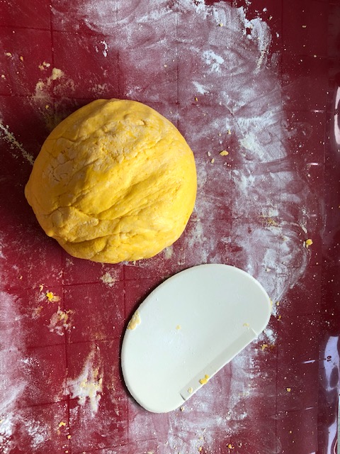 3. 南瓜泥放涼後,慢慢加入糯米粉,並揉成麵糰(麵團要硬,不然無法成型)。