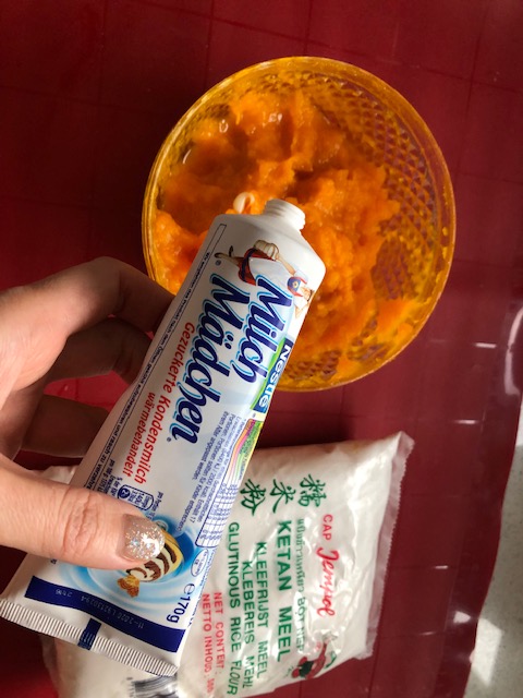 2. 南瓜蒸熟後,將皮挑出,剩餘壓碎成南瓜泥,並趁熱加入適量糖粉及煉乳。
