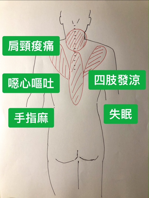 姿勢不良肩頸問題除了造成身體疼痛外, 有些人會合併出現手指麻, 失眠, 肢體僵直, 四肢冰涼,噁心頭痛等問題.
