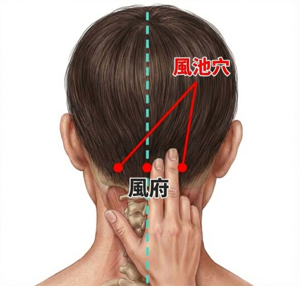 (先找到位於後腦正中央、髮際線上一寸處的風府,也是在兩側斜方肌之間的凹陷處,再以風府為中心,左右距離兩指的凹陷處就是風池穴,通常與耳垂平行。)